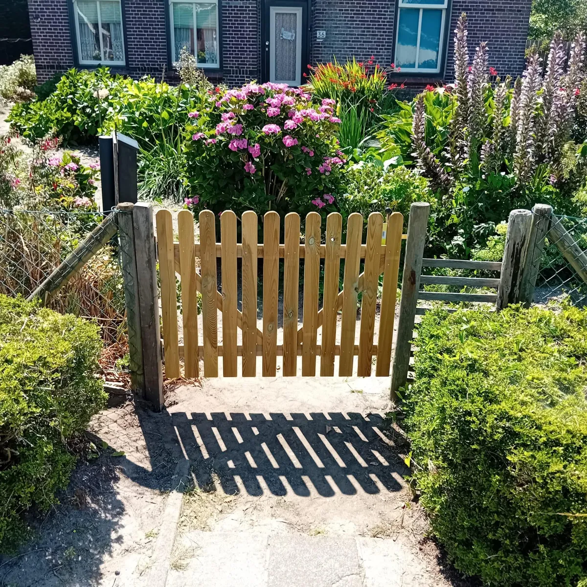 Dankzij de natuurlijke kleur van het hout en de subtiele vormgeving is dit poortje niet alleen praktisch, maar ook een echte blikvanger.