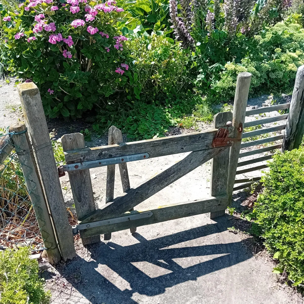 De poort vormt een stijlvolle entree tot deze karakteristieke tuin en past perfect bij de landelijke uitstraling van het huis.